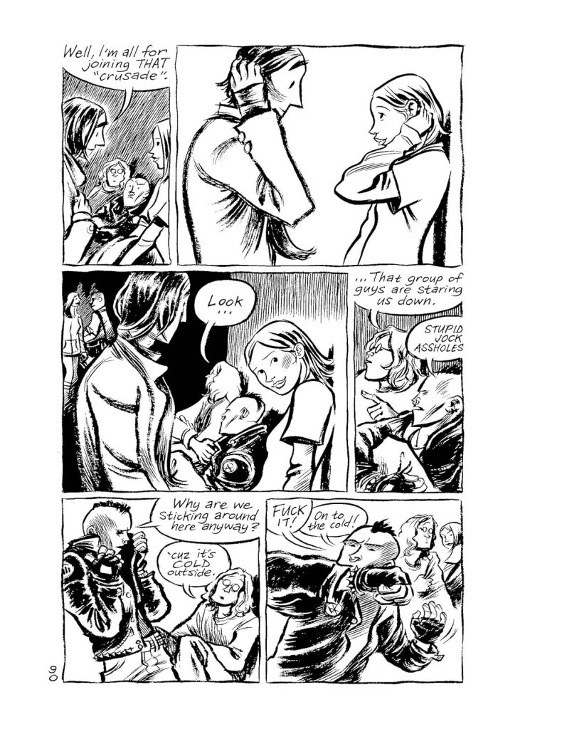 Wspomniałem o upływającym czasie i tak w komiksie jak w życiu idzie on do przodu. Przemija miłość autora do spotkanej dziewczyny, pali jej wszystkie listy i inne pamiątki, które od niej dostał -może miała na to wpływ dość znaczna odległość, która ich dzieliła albo po prostu nie było o czym gadać gdy każde pędziło do przodu w swoim własnym życiu z inną prędkością, po prostu to zgasło. Następnie Craig wyprowadza się z ortodoksyjnego miasteczka, od znienawidzonych kumpli, od pastora, rodziny i prowadzi swoje, niezależne życie takie jakie chciał- to a propo trzeciej narracji. Zostaje rysownikiem komiksów, pracuje dorywczo gdzieś daleko. Prowadzi wolne, inne życie od tego jakie planowali mu wszyscy, jakby zrzucił stary płaszcz i założył nowy na przywitanie świeżego śniegu. W komiksie często pojawia się motyw śniegu.